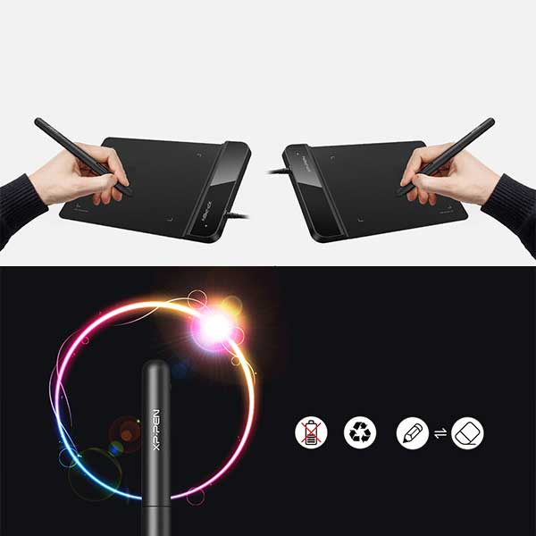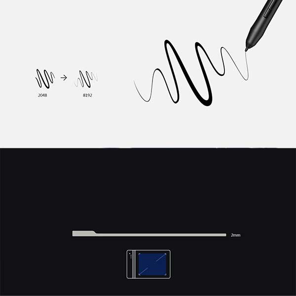 قلم تبلت: قلم این محصول نیازی به باتری ندارد. همچنین دارای حساسیت به فشار 8192 سطحی بوده و وضوح 5080LPI دارد.